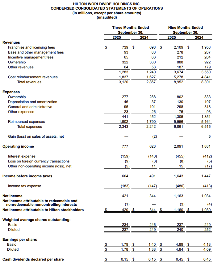 原标题:希尔顿:第三季度归母净利润同比增长22%