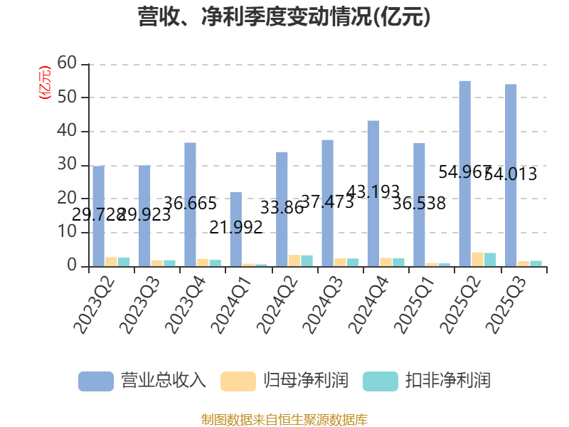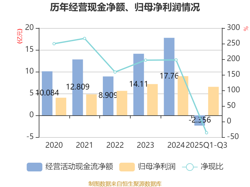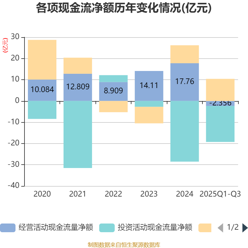 2025年前三季度,公司经营活动现金流净额为-2.36亿元,同比减少4.25亿元;筹资活动现金流净额10.41亿元,同比增加7.05亿元;投资活动现金流净额-16.92亿元,上年同期为-16.35亿元。