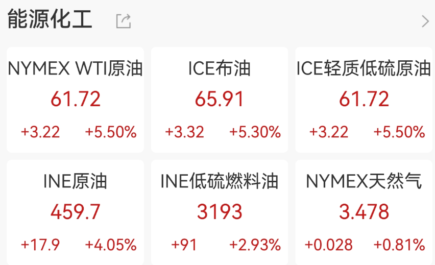布伦特原油期货逼近66美元/桶,WTI原油期货涨超61.7美元/桶。