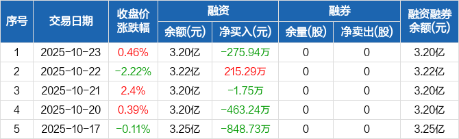 融资方面,当日融资买入826.42万元,融资偿还1102.37万元,融资净偿还275.94万元。融券方面,融券卖出0股,融券偿还0股,融券余量0股,融券余额0元。融资融券余额合计3.2亿元。