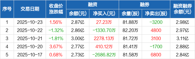 融资方面,当日融资买入1679.41万元,融资偿还1652.18万元,融资净买入27.23万元。融券方面,融券卖出1300股,融券偿还4500股,融券余量81.88万股,融券余额1116.02万元。融资融券余额合计2.98亿元。