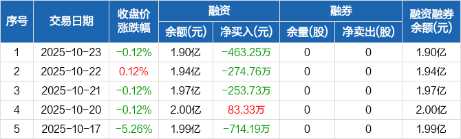 融资方面,当日融资买入261.08万元,融资偿还724.33万元,融资净偿还463.25万元,连续3日净偿还累计991.73万元。融券方面,融券卖出0股,融券偿还0股,融券余量0股,融券余额0元。融资融券余额合计1.9亿元。