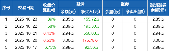 融资方面,当日融资买入570.02万元,融资偿还1025.74万元,融资净偿还455.72万元,连续3日净偿还累计1505.06万元。融券方面,融券卖出0股,融券偿还0股,融券余量0股,融券余额0元。融资融券余额合计2.85亿元。