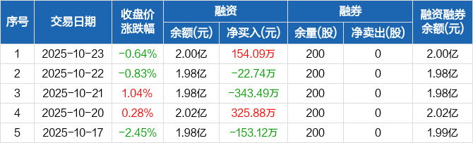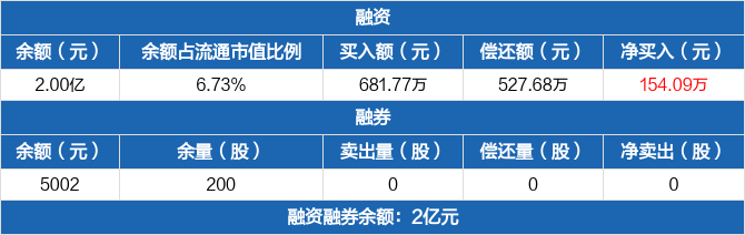 融资方面,当日融资买入681.77万元,融资偿还527.68万元,融资净买入154.09万元。融券方面,融券卖出0股,融券偿还0股,融券余量200股,融券余额5002元。融资融券余额合计2亿元。