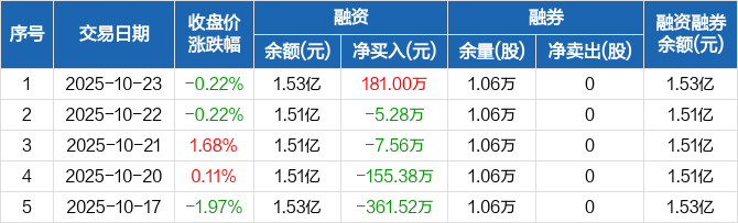 融资方面,当日融资买入423万元,融资偿还241.99万元,融资净买入181万元。融券方面,融券卖出0股,融券偿还0股,融券余量1.06万股,融券余额9.59万元。融资融券余额合计1.53亿元。