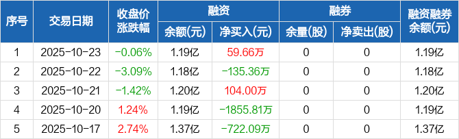 融资方面,当日融资买入534.73万元,融资偿还475.07万元,融资净买入59.66万元。融券方面,融券卖出0股,融券偿还0股,融券余量0股,融券余额0元。融资融券余额合计1.19亿元。