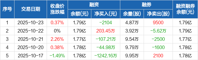 融资方面,当日融资买入1005.44万元,融资偿还1005.65万元,融资净偿还2104元。融券方面,融券卖出1.77万股,融券偿还8200股,融券余量4.87万股,融券余额13.25万元。融资融券余额合计1.79亿元。