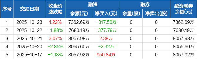 融资方面,当日融资买入335.95万元,融资偿还653.45万元,融资净偿还317.5万元。融券方面,融券卖出0股,融券偿还0股,融券余量0股,融券余额0元。融资融券余额合计7362.69万元。
