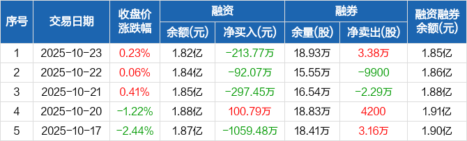 融资方面,当日融资买入423.08万元,融资偿还636.85万元,融资净偿还213.77万元,连续3日净偿还累计603.29万元。融券方面,融券卖出3.43万股,融券偿还500股,融券余量18.93万股,融券余额324.08万元。融资融券余额合计1.85亿元。