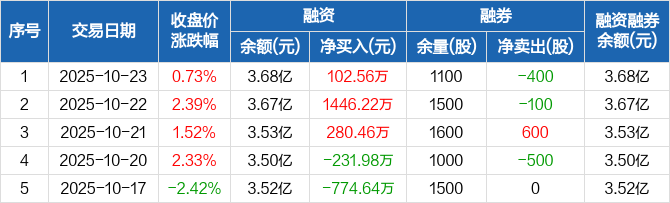 融资方面,当日融资买入1667.72万元,融资偿还1565.16万元,融资净买入102.56万元,连续3日净买入累计1829.24万元。融券方面,融券卖出0股,融券偿还400股,融券余量1100股,融券余额7590元。融资融券余额合计3.68亿元。