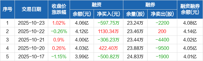 融资方面,当日融资买入894.84万元,融资偿还1492.6万元,融资净偿还597.75万元。融券方面,融券卖出0股,融券偿还2200股,融券余量23.24万股,融券余额183.57万元。融资融券余额合计4.08亿元。