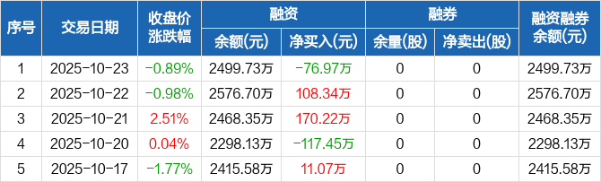融资方面,当日融资买入126.75万元,融资偿还203.72万元,融资净偿还76.97万元。融券方面,融券卖出0股,融券偿还0股,融券余量0股,融券余额0元。融资融券余额合计2499.73万元。
