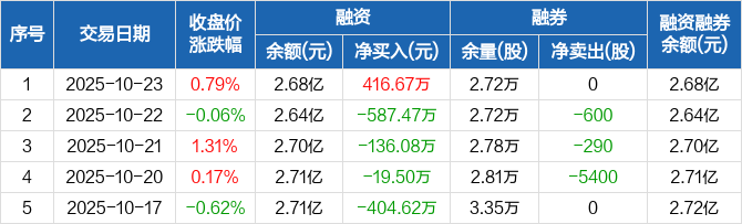 融资方面,当日融资买入1147.01万元,融资偿还730.34万元,融资净买入416.67万元。融券方面,融券卖出0股,融券偿还0股,融券余量2.72万股,融券余额48.81万元。融资融券余额合计2.68亿元。