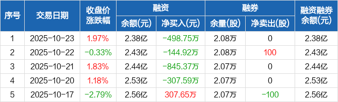 融资方面,当日融资买入912.66万元,融资偿还1411.4万元,融资净偿还498.75万元,连续4日净偿还累计1796.63万元。融券方面,融券卖出0股,融券偿还0股,融券余量2.08万股,融券余额12.92万元。融资融券余额合计2.38亿元。