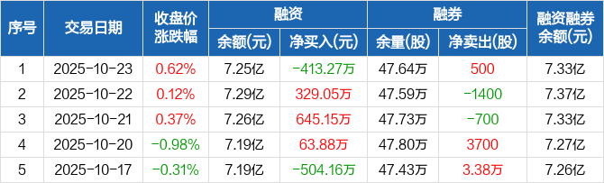 融资方面,当日融资买入857.07万元,融资偿还1270.34万元,融资净偿还413.27万元。融券方面,融券卖出900股,融券偿还400股,融券余量47.64万股,融券余额779.42万元。融资融券余额合计7.33亿元。