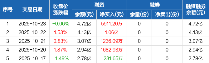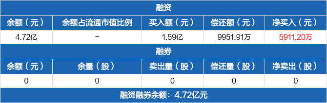 融资方面,当日融资买入1.59亿元,融资偿还9951.91万元,融资净买入5911.2万元,连续4日净买入累计1.95亿元。融券方面,融券卖出0份,融券偿还0份,融券余量0份,融券余额0元。融资融券余额合计4.72亿元。