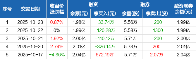 融资方面,当日融资买入542.62万元,融资偿还576.36万元,融资净偿还33.74万元,连续4日净偿还累计590.28万元。融券方面,融券卖出0股,融券偿还200股,融券余量5.56万股,融券余额38.64万元。融资融券余额合计1.99亿元。