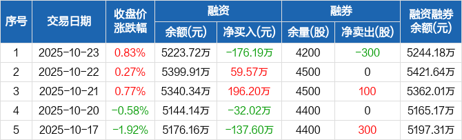 融资方面,当日融资买入124.91万元,融资偿还301.1万元,融资净偿还176.19万元。融券方面,融券卖出0股,融券偿还300股,融券余量4200股,融券余额20.45万元。融资融券余额合计5244.18万元。