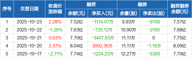 新宙邦融资融券信息显示,2025年10月23日融资净偿还1114.07万元;融资余额7.52亿元,较前一日下降1.46%。