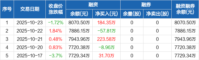 融资方面,当日融资买入461.75万元,融资偿还277.4万元,融资净买入184.35万元。融券方面,融券卖出0股,融券偿还0股,融券余量0股,融券余额0元。融资融券余额合计8070.5万元。