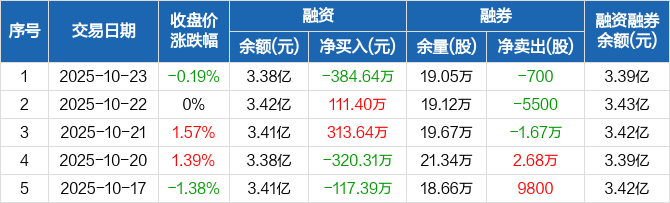 融资方面,当日融资买入614.29万元,融资偿还998.93万元,融资净偿还384.64万元。融券方面,融券卖出300股,融券偿还1000股,融券余量19.05万股,融券余额98.3万元。融资融券余额合计3.39亿元。