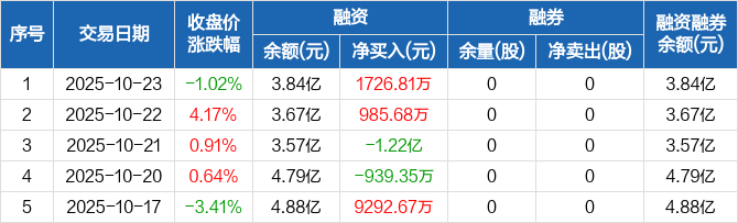 融资方面,当日融资买入4135.48万元,融资偿还2408.68万元,融资净买入1726.81万元。融券方面,融券卖出0股,融券偿还0股,融券余量0股,融券余额0元。融资融券余额合计3.84亿元。