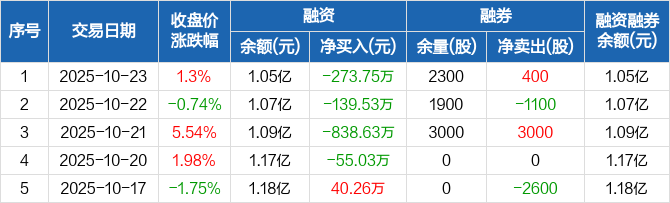 融资方面,当日融资买入546.61万元,融资偿还820.35万元,融资净偿还273.75万元,连续4日净偿还累计1306.94万元。融券方面,融券卖出400股,融券偿还0股,融券余量2300股,融券余额2.51万元。融资融券余额合计1.05亿元。