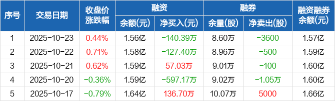 融资方面,当日融资买入642.2万元,融资偿还782.59万元,融资净偿还140.39万元。融券方面,融券卖出500股,融券偿还4100股,融券余量8.6万股,融券余额98.13万元。融资融券余额合计1.57亿元。