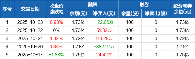 融资方面,当日融资买入582.46万元,融资偿还604.52万元,融资净偿还22.06万元。融券方面,融券卖出0股,融券偿还0股,融券余量100股,融券余额1083元。融资融券余额合计1.73亿元。