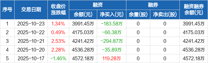 融资方面,当日融资买入132.78万元,融资偿还316.36万元,融资净偿还183.58万元,连续4日净偿还累计580.73万元。融券方面,融券卖出0股,融券偿还0股,融券余量0股,融券余额0元。融资融券余额合计3991.45万元。