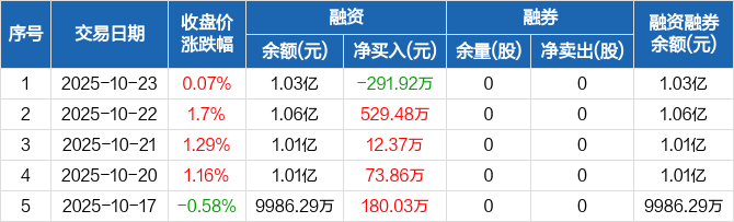 融资方面,当日融资买入353.98万元,融资偿还645.9万元,融资净偿还291.92万元。融券方面,融券卖出0股,融券偿还0股,融券余量0股,融券余额0元。融资融券余额合计1.03亿元。