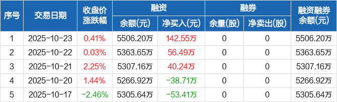 融资方面,当日融资买入433.37万元,融资偿还290.83万元,融资净买入142.55万元,连续3日净买入累计239.27万元。融券方面,融券卖出0股,融券偿还0股,融券余量0股,融券余额0元。融资融券余额合计5506.2万元。