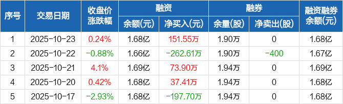 融资方面,当日融资买入355.91万元,融资偿还204.36万元,融资净买入151.55万元。融券方面,融券卖出0股,融券偿还0股,融券余量1.9万股,融券余额23.5万元。融资融券余额合计1.68亿元。
