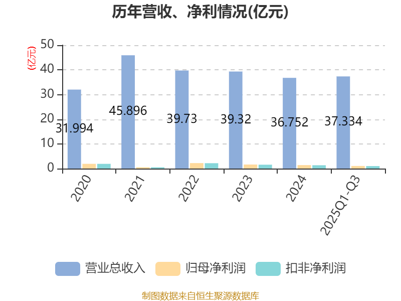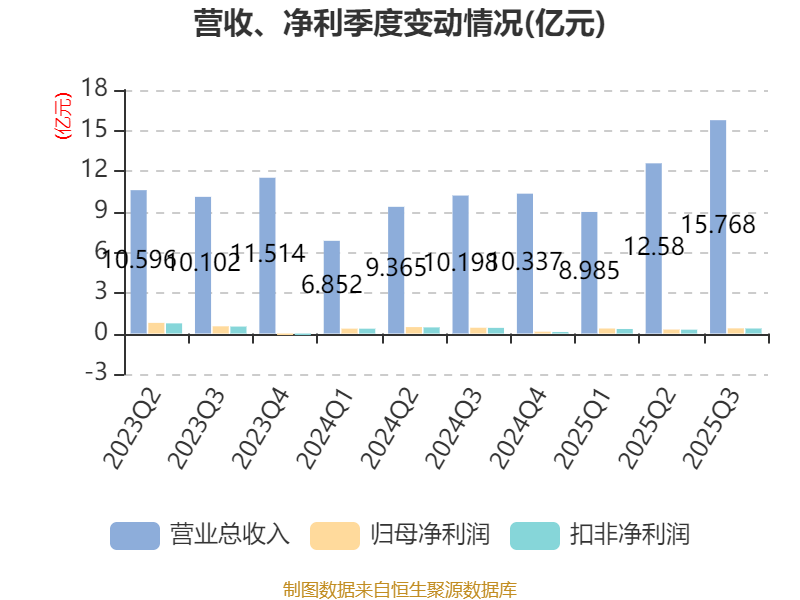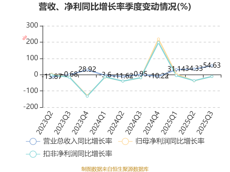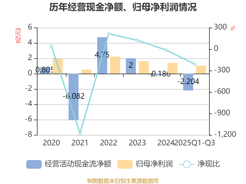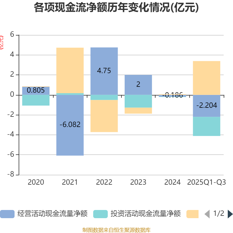 2025年前三季度,公司经营活动现金流净额为-2.2亿元,同比增加7833.92万元;筹资活动现金流净额3.39亿元,同比增加2.07亿元;投资活动现金流净额-1.91亿元,上年同期为3126.21万元。