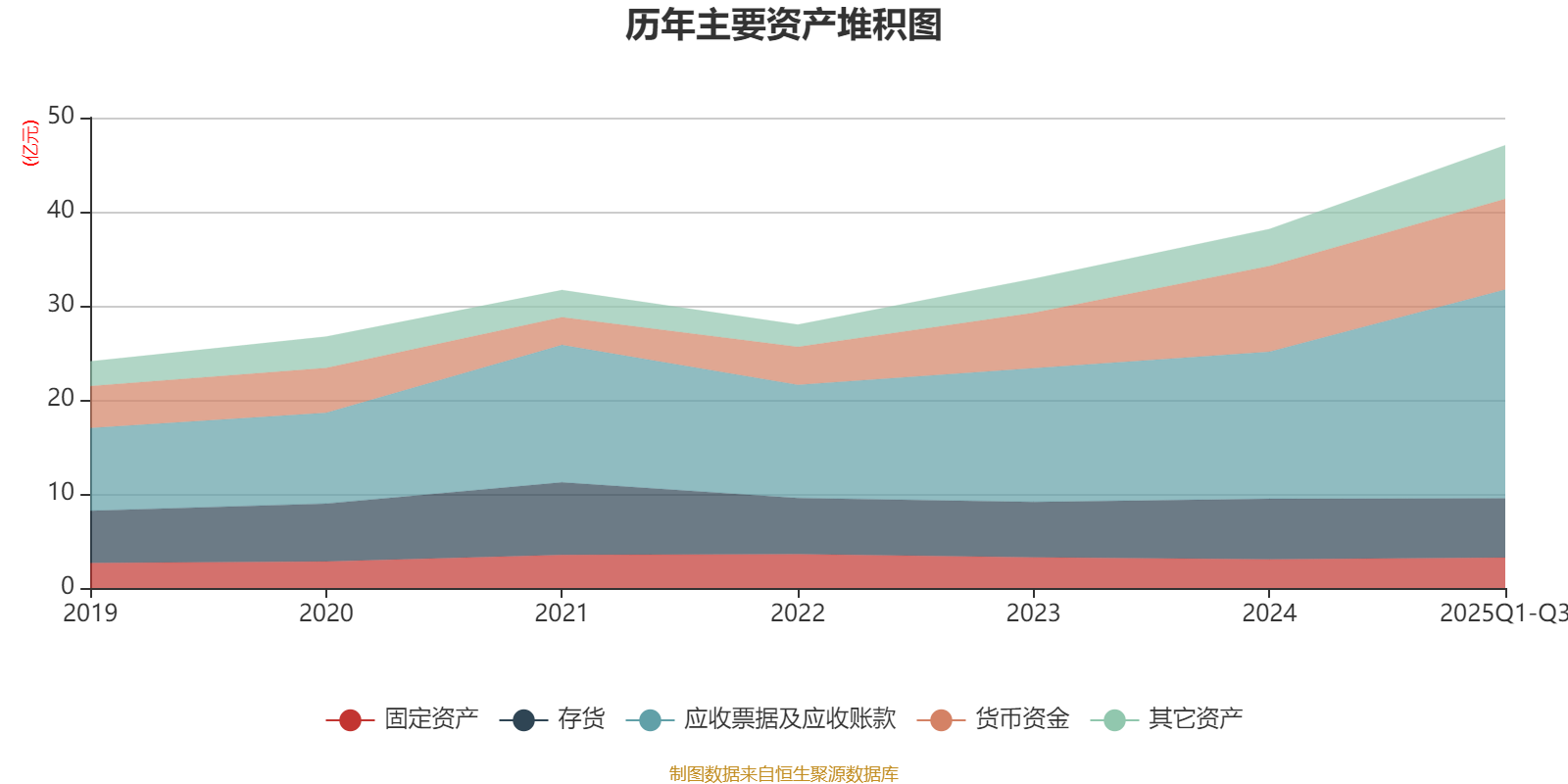 资产重大变化方面,截至2025年三季度末,公司应收票据及应收账款较上年末增加41.79%,占公司总资产比重上升6.13个百分点;存货较上年末减少1.77%,占公司总资产比重下降3.43个百分点;货币资金较上年末增加5.8%,占公司总资产比重下降3.39个百分点;在建工程合计较上年末增加346.39%,占公司总资产比重上升1.53个百分点。