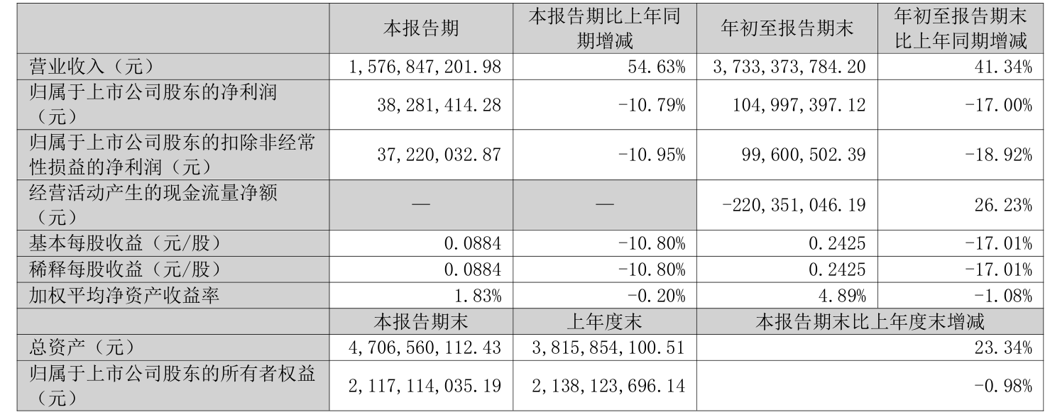 中证智能财讯金龙羽(002882)10月25日披露2025年第三季度报告。前三季度公司实现营业总收入37.33亿元,同比增长41.34%;归母净利润1.05亿元,同比下降17.00%;扣非净利润9960.05万元,同比下降18.92%;经营活动产生的现金流量净额为-2.2亿元,上年同期为-2.99亿元;报告期内,金龙羽基本每股收益为0.2425元,加权平均净资产收益率为4.89%。