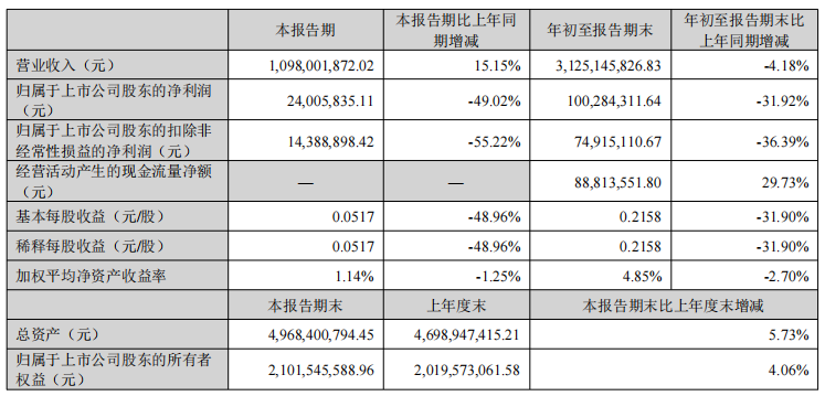 “增收不增利”成为三季度突出症结。 在单季营收实现15.15%的同比增长至10.98亿元的同时,归母净利润却大幅下滑49.02%至2400.58万元。这一强烈反差背后,是利润空间遭遇的多重挤压:一方面,计入当期损益的政府补助同比减少约30%;另一方面,资产减值损失同比扩大162.65个百分点。