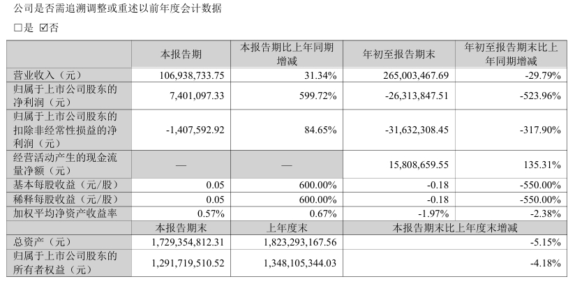 截至三季度末,公司总资产17.29亿元,较上年度末下降5.2%;归母净资产为12.92亿元,较上年度末下降4.2%。