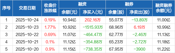 融资方面,当日融资买入3974.54万元,融资偿还3772.38万元,融资净买入202.16万元。融券方面,融券卖出1.72万股,融券偿还15.61万股,融券余量55.07万股,融券余额571.08万元。融资融券余额合计11亿元。