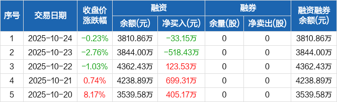 融资方面,当日融资买入437.21万元,融资偿还470.35万元,融资净偿还33.15万元。融券方面,融券卖出0股,融券偿还0股,融券余量0股,融券余额0元。融资融券余额合计3810.86万元。