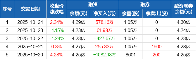 融资方面,当日融资买入3357.44万元,融资偿还2779.28万元,融资净买入578.16万元。融券方面,融券卖出0股,融券偿还0股,融券余量1.05万股,融券余额66.66万元。融资融券余额合计4.3亿元。