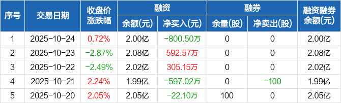 融资方面,当日融资买入960.39万元,融资偿还1760.89万元,融资净偿还800.5万元。融券方面,融券卖出0股,融券偿还0股,融券余量0股,融券余额0元。融资融券余额合计2亿元。