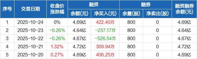 融资方面,当日融资买入1594.89万元,融资偿还1172.49万元,融资净买入422.4万元。融券方面,融券卖出0股,融券偿还0股,融券余量800股,融券余额3048元。融资融券余额合计4.69亿元。