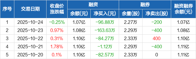 融资方面,当日融资买入169.83万元,融资偿还266.71万元,融资净偿还96.88万元,连续5日净偿还累计428.47万元。融券方面,融券卖出0股,融券偿还200股,融券余量2.27万股,融券余额44.64万元。融资融券余额合计1.07亿元。