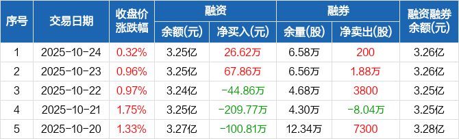 融资方面,当日融资买入923.53万元,融资偿还896.91万元,融资净买入26.62万元。融券方面,融券卖出1300股,融券偿还1100股,融券余量6.58万股,融券余额62.51万元。融资融券余额合计3.26亿元。