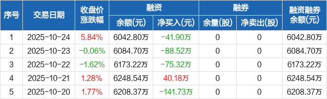 融资方面,当日融资买入933.79万元,融资偿还975.69万元,融资净偿还41.9万元,连续3日净偿还累计205.74万元。融券方面,融券卖出0股,融券偿还0股,融券余量0股,融券余额0元。融资融券余额合计6042.8万元。