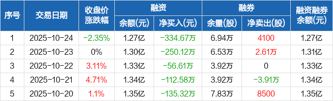 融资方面,当日融资买入427.52万元,融资偿还762.19万元,融资净偿还334.67万元,连续6日净偿还累计919.73万元。融券方面,融券卖出1.14万股,融券偿还7300股,融券余量6.94万股,融券余额20.2万元。融资融券余额合计1.27亿元。