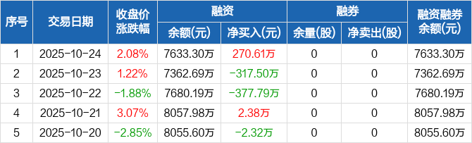 融资方面,当日融资买入653.65万元,融资偿还383.03万元,融资净买入270.61万元。融券方面,融券卖出0股,融券偿还0股,融券余量0股,融券余额0元。融资融券余额合计7633.3万元。