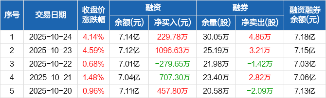 融资方面,当日融资买入4975.85万元,融资偿还4746.07万元,融资净买入229.78万元。融券方面,融券卖出6.54万股,融券偿还1.68万股,融券余量30.05万股,融券余额385.24万元。融资融券余额合计7.18亿元。