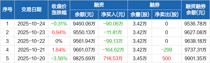 融资方面,当日融资买入206.28万元,融资偿还296.34万元,融资净偿还90.06万元,连续4日净偿还累计365.63万元。融券方面,融券卖出0股,融券偿还0股,融券余量3.42万股,融券余额76.72万元。融资融券余额合计9536.78万元。